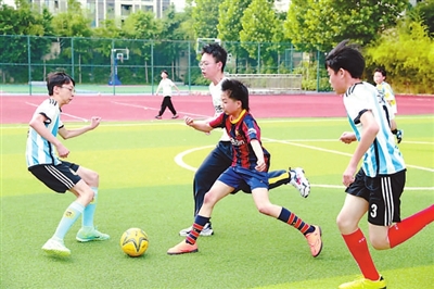 浙江省金華師范學(xué)校附屬小學(xué)的學(xué)生在操場上踢足球。       學(xué)校供圖
