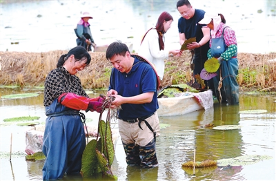 在江蘇省淮安市金湖縣呂良鎮的芡實種植基地,江蘇大學食品與生物工程學院教授崔鳳杰(前左二)與基地工作人員一起調研芡實移植情況。