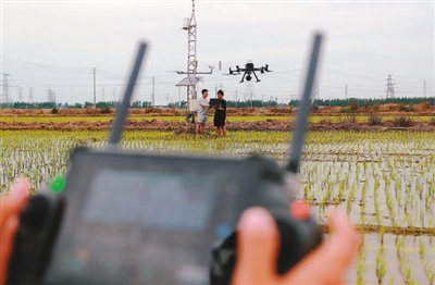在江蘇鎮江新區永興農機機械化專業合作社,江蘇大學農業工程學院師生利用低空無人機采集大田信息。
