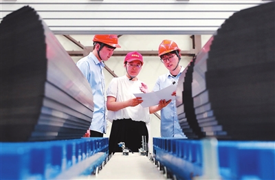 在江蘇大全集團油浸式變壓器總裝車間,江蘇大學機械工程學院教授黃娟(中)現場解答企業生產中遇到的設計圖紙規范性問題。