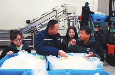 在江蘇蘇芡農業產業發展有限公司冷鏈加工車間,崔鳳杰教授(前右一)帶領師生調研芡實加工情況。