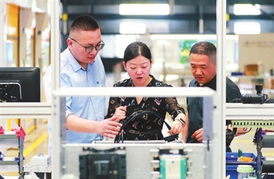 在江蘇大全集團低壓成套電氣生產車間,江蘇大學計算機科學與通信工程學院教師宋雪樺(中)、金華(右)與企業技術人員交流基于AI的自動化生產線檢測技術。
