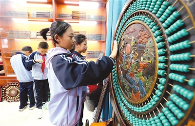 10月14日,隴西縣紅星小學學生在算盤非遺體驗基地參觀。