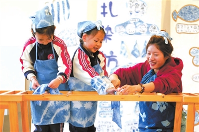 11月19日,四川省樂山市實驗幼兒園至樂分園教師在指導孩子們晾曬自己的扎染作品。世界兒童日(11月20日)來臨之際,該幼兒園開展“樂學扎染 感受非遺”活動,教師指導孩子們體驗扎染制作技藝,感受中華優秀傳統文化的魅力。