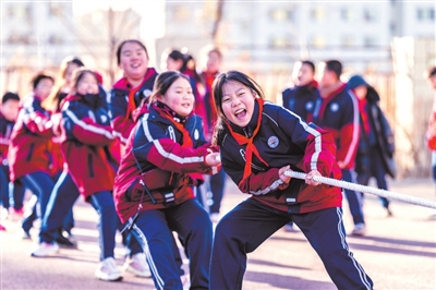 11月25日,內(nèi)蒙古自治區(qū)呼和浩特市玉泉區(qū)石東路小學(xué)學(xué)生在操場上進行拔河比賽。該校積極推動校園體育活動“加時”“加量”,通過豐富體育課程、成立體育興趣小組和社團等舉措,讓學(xué)生在快樂運動中鍛煉身體、增強體質(zhì)。丁根厚 攝