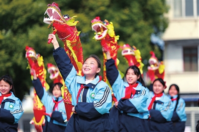 湖北省襄陽市樊城區(qū)竹條中心小學(xué)的學(xué)生們在課后服務(wù)時間練習(xí)舞龍。通訊員 聶志鵬 攝