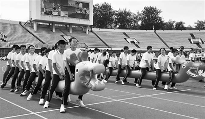 圖① 學(xué)生進行趣味集體比賽——龍行萬里。
