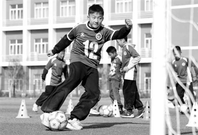 江蘇省海安市李堡鎮中心小學學生在體育課上練習踢足球。周強 攝