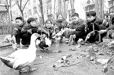 在江蘇省徐州市睢寧縣第二小學(xué)的校園“動物園”里,參加勞動課的學(xué)生給鴨子、鵝喂青菜。通訊員 洪星 攝