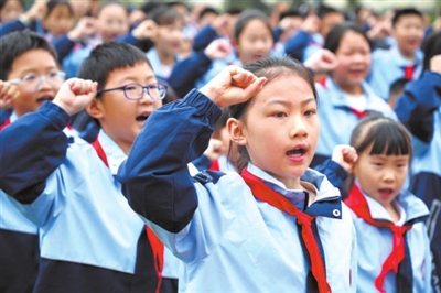安徽省六安市裕安區紫荊小學少先隊員在宣誓。田凱平 攝