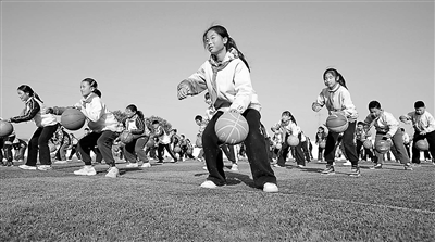 江蘇省海安市李堡鎮曹園小學的學生在大課間進行籃球運動。 周強 攝