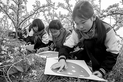 ②重慶市云陽縣蔈草鎮歧陽小學開展“識花·畫花·詠花”主題實踐課,圖為學生在梨園作畫。