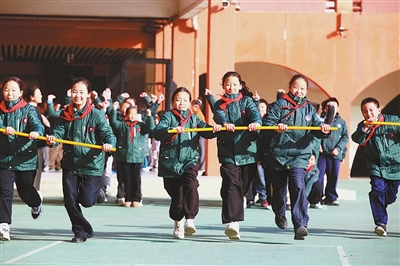 1月15日,江蘇省徐州市鼓樓小學學生在大課間參加推桿跑活動。該校根據季節特點,開展跳繩、推桿跑等適合學生冬季運動的大課間活動,引導學生走出教室進行體育鍛煉,享受運動帶來的快樂。蒯創 攝