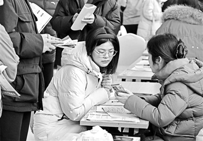 1月30日,求職者在青島西海岸新區人力資源大市場參加“青雁歸巢”招聘會。