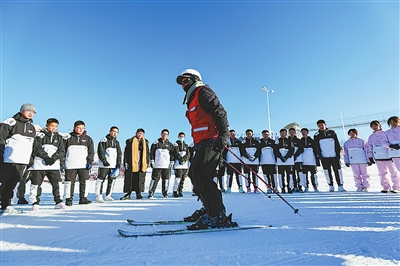 內蒙古自治區鄂爾多斯市,九城宮國際滑雪場,冬日的陽光斜照雪道,泛著細碎的銀光。“減速時,雪板呈‘內八’,腳尖向內,膝蓋下壓……”學生們低聲重復動作要領,試探挪動腳下的雪板,在教練的引導下開始緩緩向前滑行。